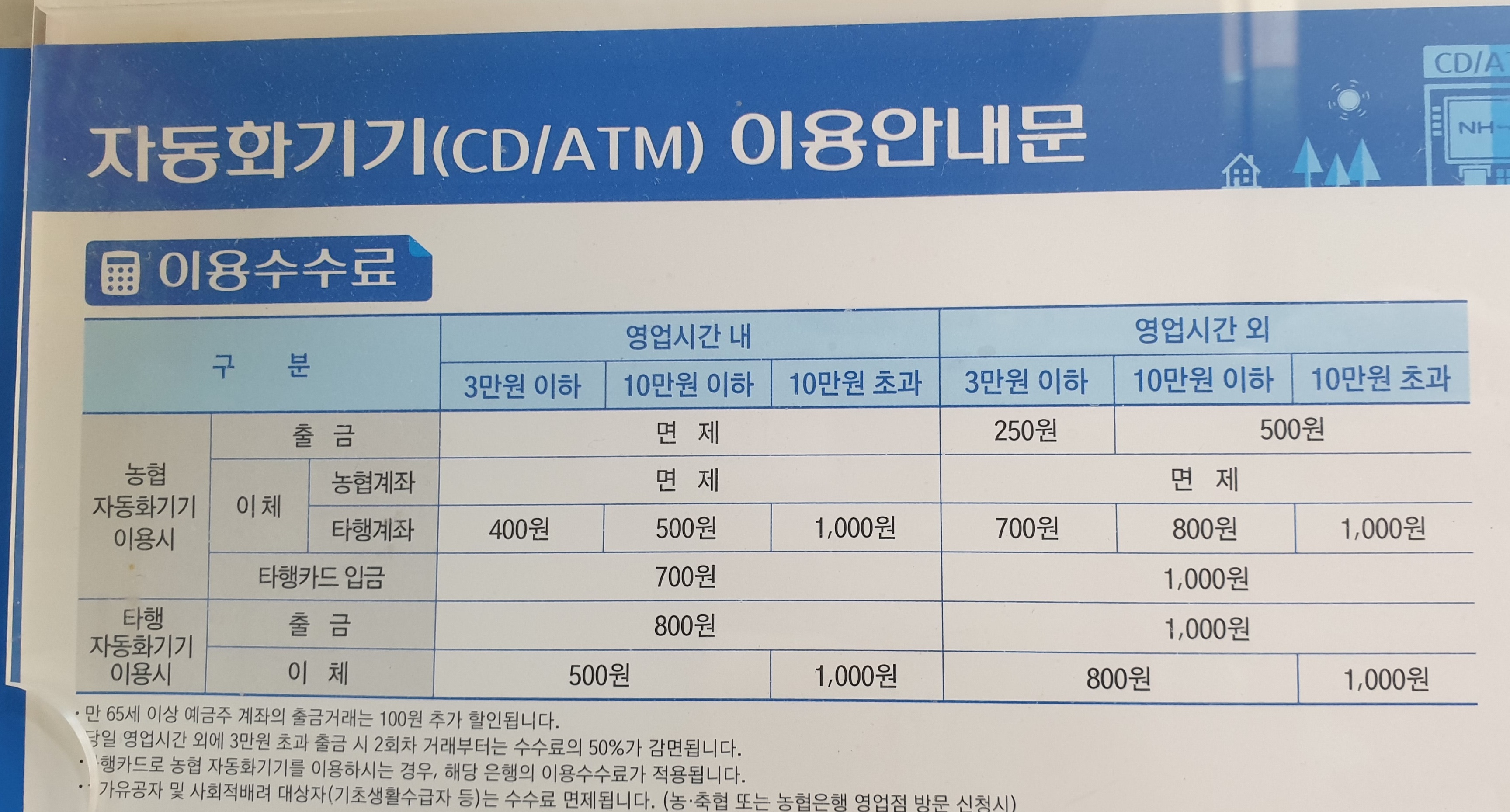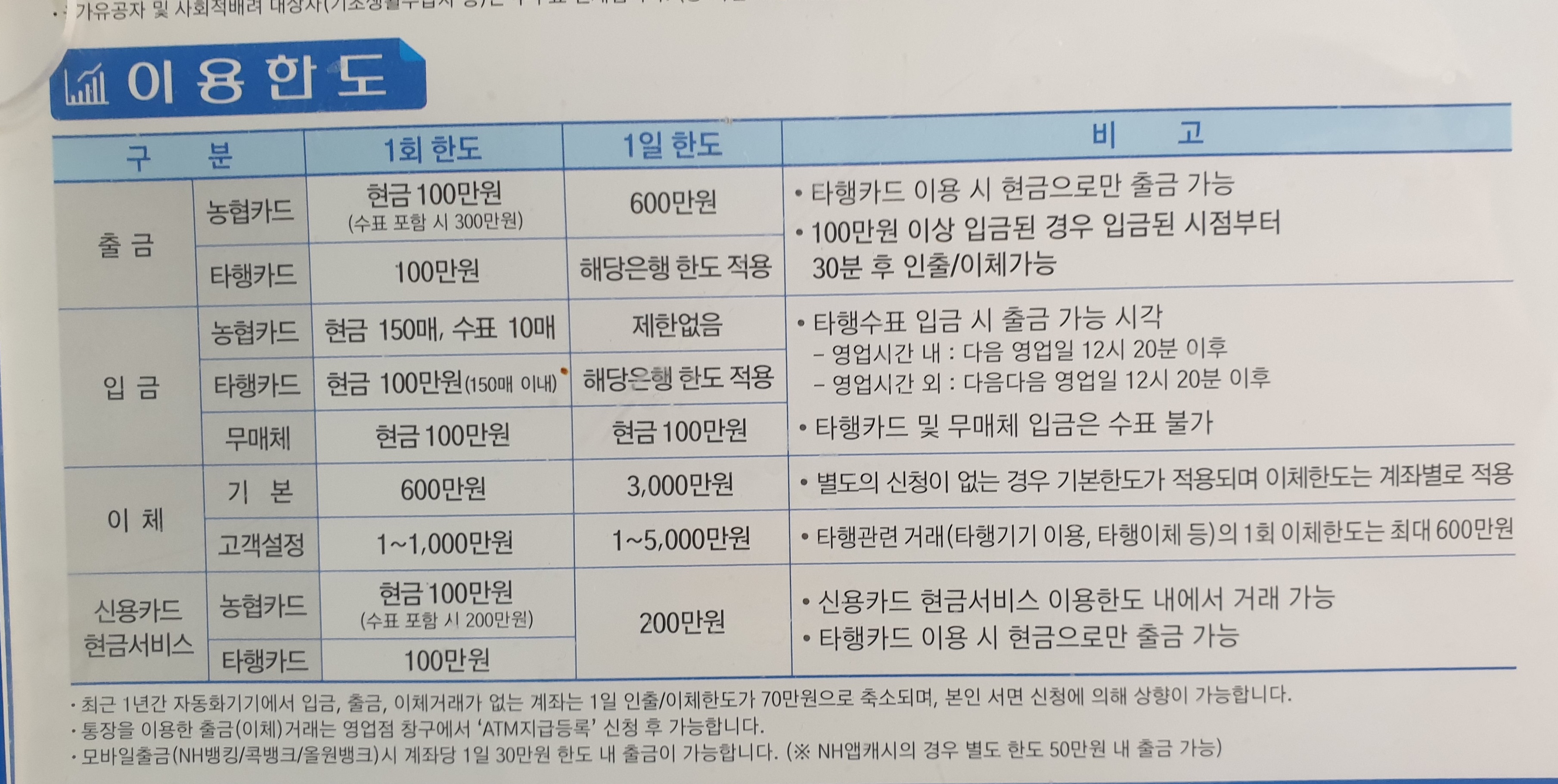 오늘 농협 은행 갔다가 자동화기기, ATM기 이용수수료와 이용한도, 영업시간이 적혀져 있어 다음에 참고하려고 사진 찍어왔다. 혹시나 찾으시는 분 계시면 참고하시길..