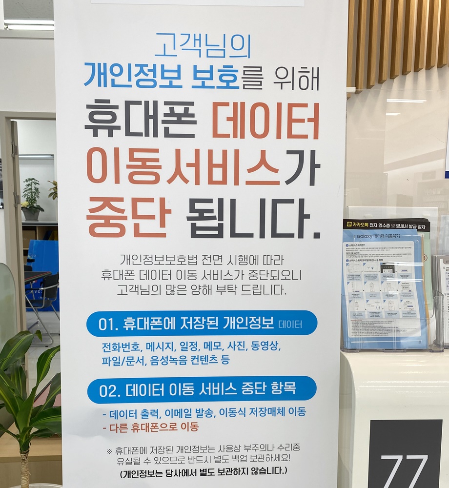 최근 휴대폰 데이터 이동 서비스가 중단되었다고 한다. 기존에는 대리점에서 이동식 저장매체를 이용해 데이터를 복사할 수 있었지만, 이제는 개인정보 보호 강화로 인해 전화번호, 메시지, 일정, 메모, 사진, 동영상, 파일 등이 복사 불가합니다.